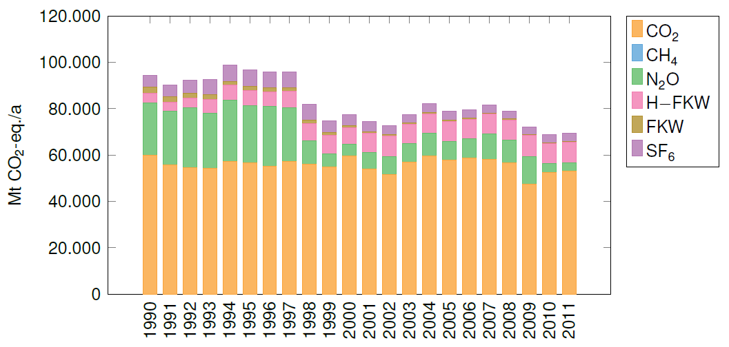 Über den Energieverbrauch hinaus verursachen bestimmte industrielle Herstellungsprozesse und die Anwendung von Lösemitteln und anderer Produkte neben bestimmten Luftschadstoffen wie SO2, NOx und flüchtige organische Schadstoffe (NMVOC) auch THG-Emissionen. Weiterhin entfällt ein beachtlicher Anteil auf industrielle Prozesse und die Anwendung von bspw. Lösemitteln. Die Hauptemissionsquelle besteht bei der chemischen oder physikalischen Transformation von Rohstoffen.